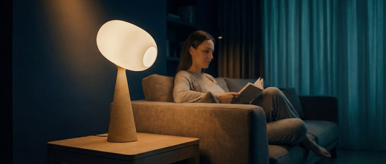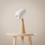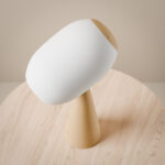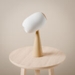 Autorska lampa w całości zaprojektowana i wykonana przez Spectrum Studio w Polsce, z dbałością o proporcje i detal. Pochylona, miękka forma buduje atmosferę bez dominacji, a matowy klosz z naturalnym drewnem tworzą spokojny kontrast. Światło dopełnia całość – subtelnie i nienachalnie.